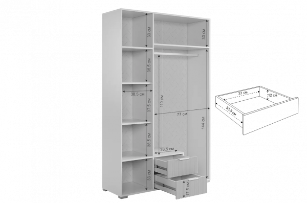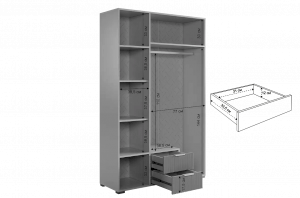 Комплектация: Полка 2 шт., трехдверный шкаф, однодверный шкаф, трехдверная антресоль, стол