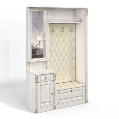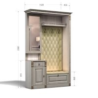 Прихожая выполнена в классическом стиле с декоративными элементами. Фасады и декоративные элементы патинированы, патина наносится вручную, по классической итальянской технологии и защищена матовым лаком. Мягкие элементы (вешалка и сиденье) выполнены из экокожи, декорированы каретной стяжкой.