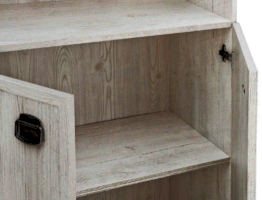 Шкаф разделен на 2 отделения: верхнее –открытое отделение с полками, нижнее – отделение за распашными дверями, за которыми расположена 1 полка