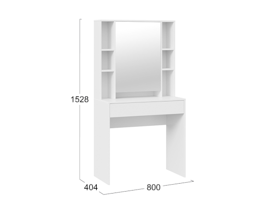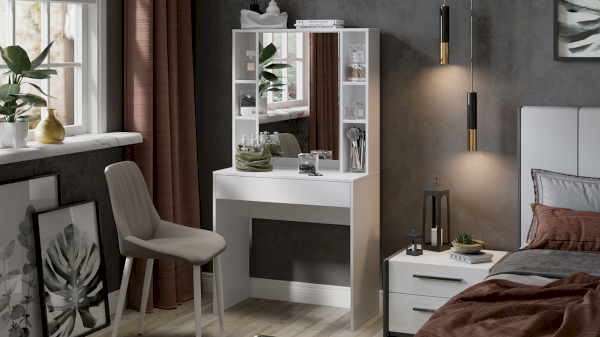 Помимо внешней привлекательности стол имеет большое зеркало, за которым размещены скрытые полки для хранения всех необходимых аксессуаров и косметики. Наличие открытых полок позволит установить предметы декора, а практичный выдвижной ящик добавит места для необходимых мелочей. В этом туалетном столике нет ничего лишнего, только самое необходимое для уголка женской красоты.