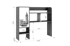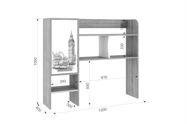 Данная надстройка оборудована вместительными полками, предназначенными для хранения книг, учебников, папок и другой необходимой документации. Также на этих полках можно разместить офисную технику, такую как сканер или принтер. Особенностью дизайна является фасад закрытой ниши с оригинальным принтерным рисунком.