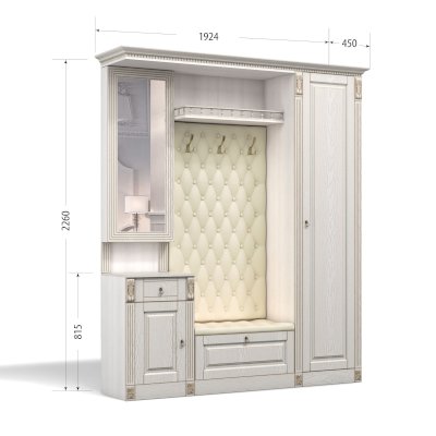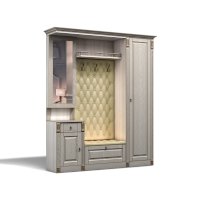 Прихожая выполнена в классическом стиле с декоративными элементами. Фасады и декоративные элементы патинированы, патина наносится вручную, по классической итальянской технологии и защищена матовым лаком. Мягкие элементы (вешалка и сиденье) выполнены из экокожи, декорированы каретной стяжкой.