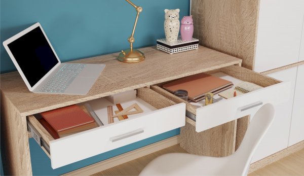 Письменные столы "Стелс" - это четыре варианта, отличных по ширине, глубине и наполнению - удобное место учебы, работы и творчества. В столах много места для письменных принадлежностей с выдвижными ящиками полного выдвижения. Благодаря небольшой глубине подходят как для небольших комнат, так и просторных кабинетов.