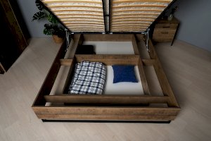 Планкованное изголовье с изгибом — два варианта конфигурации: с полкой и без неё. Кровать может быть оснащена ортопедическим основанием с подъёмным механизмом, который открывает доступ к вместительному коробу для хранения.