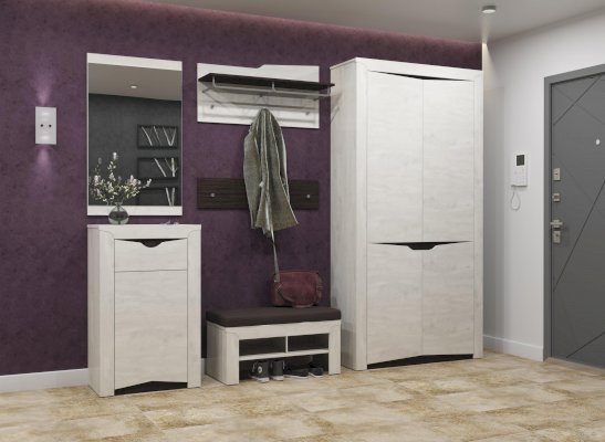 Это не вешалка, а настоящая мини-прихожая! Она состоит из двух модулей, каждая из которых может существовать как вместе, так и отдельно друг от друга. Можно повесить их рядом, а можно – один под другим. В верхнем модуле предусмотрена полка под головные уборы, две зонированные штанги под вешалки с верхней одеждой и крючки, на которых разместится уличная одежда без вешалок. Верх модуля – ассиметричен и находится на разных уровнях. Практичности в этом нет, но есть красота! Если второй модуль разместить ниже, на нем будут хорошо смотреться зонты и сумки. А можно – как вариант – превратить его в детскую вешалку – любой малыш сам достанет и повесит свою одежду. Если же вы повесите оба модуля рядом – на одной линии – одежды поместится в два раза больше.