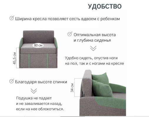 Благодаря высоте спинки подушка не падает и не заваливается назад, если на нее облокотиться. Ширина кресла позволяет сесть вдвоем с ребенком. Оптимальная высота и глубина сиденья. Удобно сидеть, опустив ноги на пол, так и с ногами на кресле.