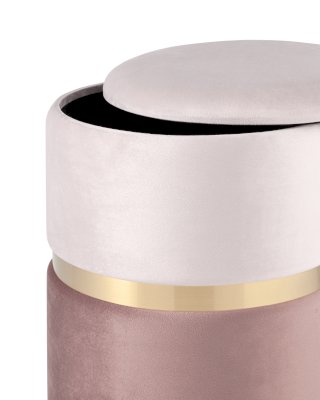 Лаконичная модель пуфа в мягкой обивке прекрасно впишется в современные интерьеры. Обивка выполнена из велюра в светлом и темном оттенках и украшена металлическим ободком в золотом цвете. Под сиденьем имеется ящик для хранения различных мелочей. В основании предусмотрены специальные подпятники, которые делают пуф более устойчивым и предотвращают скольжение.