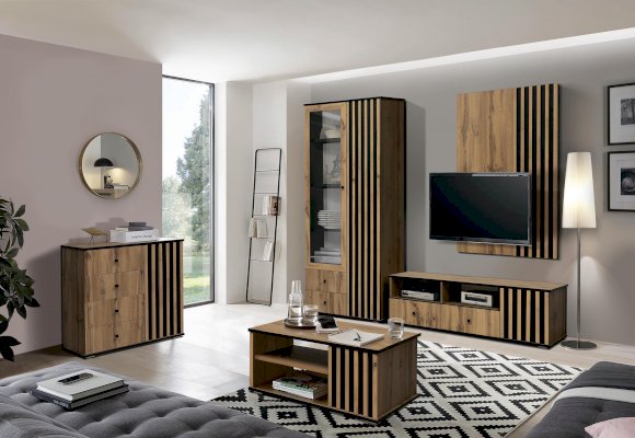Торцы модуля - сверху, снизу и по периметру открытых полок покрыты черной пленкой и удачно гармонируют с реечным фасадом. Черные рамки подчеркивают границы тумбы. Таким образом достигается постоянный контраст, что выглядит очень эффектно!