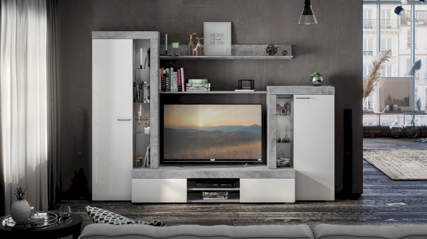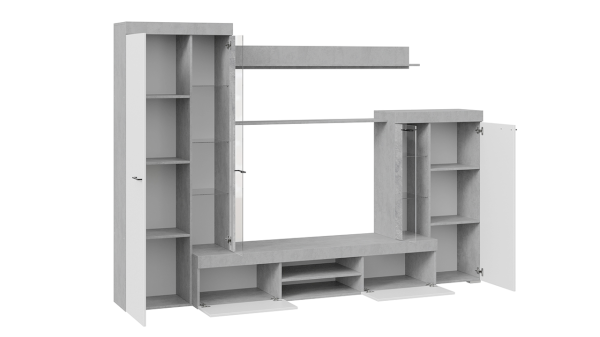 Сочетание белых фасадов, черной лицевой фурнитуры и каркасов в текстуре «Цемент светлый» способно освежить и преобразить комнату, придать интерьеру вашей гостиной современный, благородный вид.