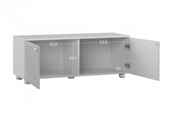Тумба оснащена двумя распашными дверцами, за которыми располагается вместительное внутреннее пространство для хранения книг, игрушек, текстиля и других необходимых вещей. Такое решение позволяет скрыть содержимое и сохранить аккуратный внешний вид комнаты.