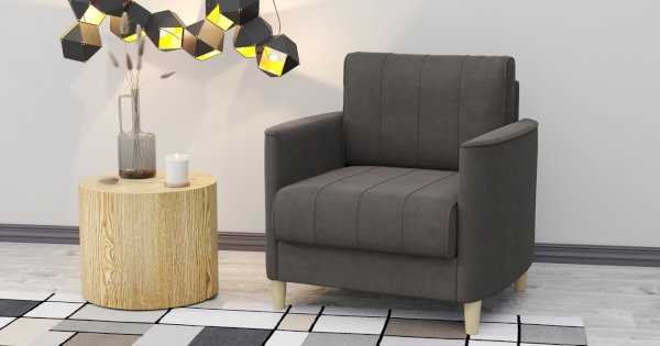 Комплект состоит из прямого и углового диванов, кресла для отдыха и пуфа.
