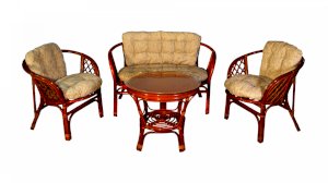 Комплект из натурального ротанга, состоящий из дивана, двух кресел и круглого столика со стеклом.
