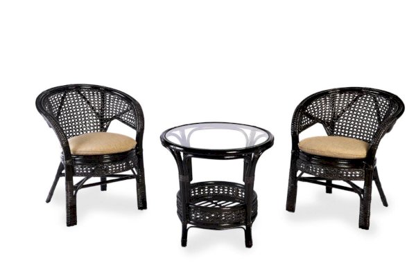 Комплект мебели Пеланги 02/15 включает в себя: 2 кресла и столик с красивым плетением снизу и полочкой, съемные подушки из материала улучшенного качества.