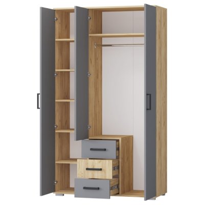 • Шкаф оснащен металлической перекладиной и полками для одежды.