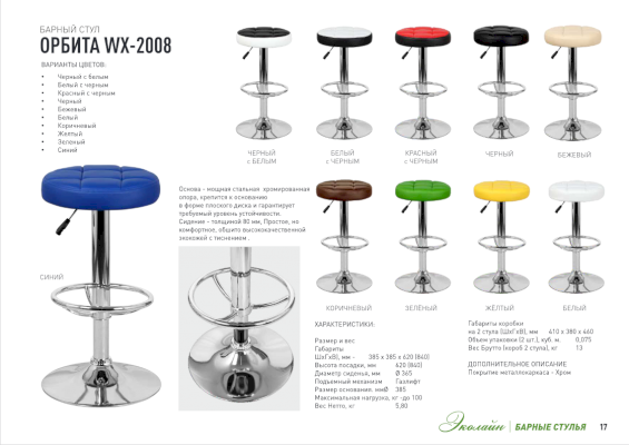 Барный стул (без спинки) ОРБИТА WX-2008 непременно придется вам по вкусу и создает в кафе неповторимую атмосферу. Основа барного стула ОРБИТА WX-2008 - мощная стальная хромированная опора, которая крепится к надежному основанию в форме плоского диска и гарантирует требуемый уровень устойчивости. Простое, но удобное сиденье, толщиной 80 мм, и оригинальное сочетание цветов обивки обеспечат посетителю комфорт.